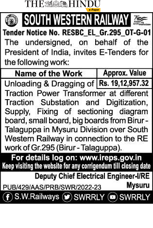 Tender for Unloading & Dragging of Traction Power Transformer at different Traction Substation and Digitization, Supply, Fixing of sectioning diagram board, small board, big boards from Birur Talaguppa in Mysuru Division over South Western Railway in connection to the RE work of Gr.295 (Birur – Talaguppa).