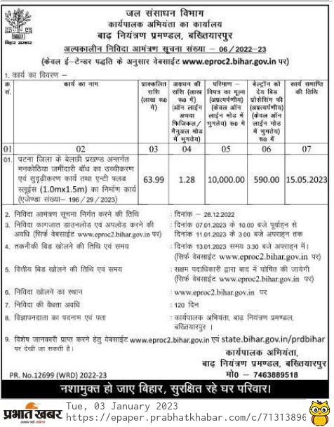 Tender for Upgradation and strengthening work of Mankothia Zamindari dam under Belgi block of Patna district and construction work of anti flood sluice (1.0mx1.5m) (Agenda No.- 196/29/2023)