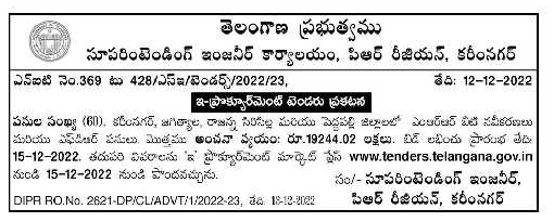 Tender for Upgradation of MRR and FR Works in Karimnagar, Jagityala, Rajanna Sirisilla and Peddapalli Districts