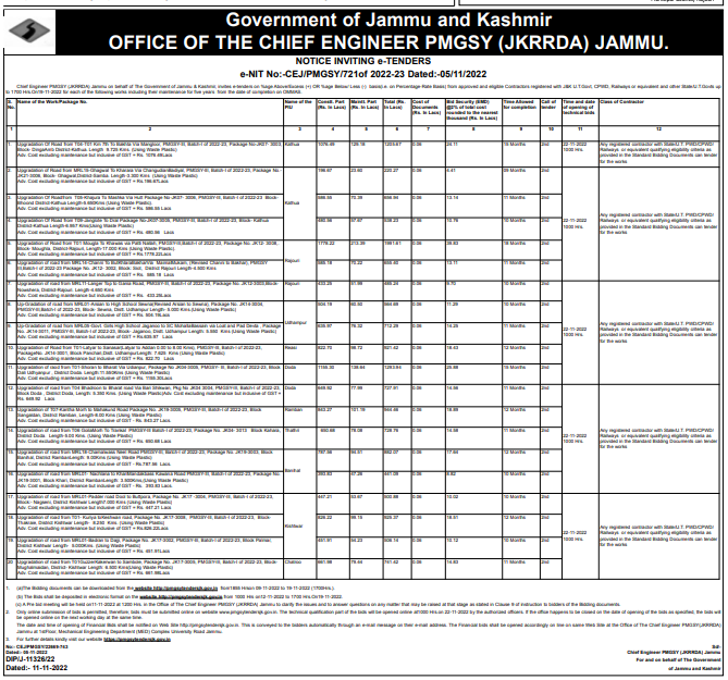 Tender for Upgradation of Road from T09-Janglote To Dral Package No-JK07-3005, PMGSY-III, Batch-1 of 2022-23, Block- Kathua District-Kathua Length-6.957 Kms(Using Waste Plastic) Adv. Cost excluding maintenance but inclusive of GST = Rs. 480.56 Lacs