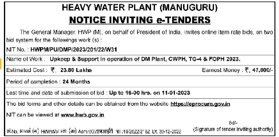 Tender for Upkeep & Support in operation of DM Plant, CWPH, TG4 & FOPH 2023.
