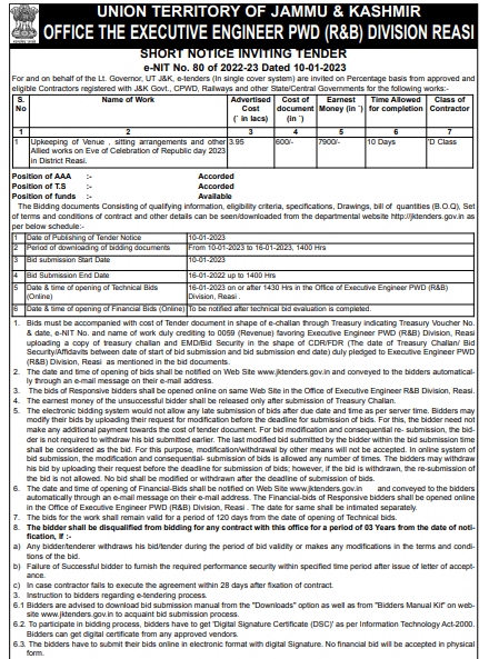Tender for Upkeeping of Venue, sitting arrangements and other 3.95 Allied works on Eve of Celebration of Republic day 2023