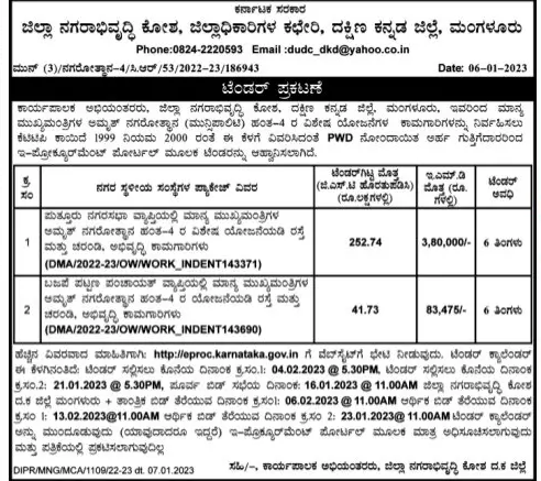 Tender for Urban Local Bodies Package Details Road and Drainage, Development works under the special scheme of Amrit Urban Development Phase-4 of Hon’ble Chief Minister under Puttur Municipal Council.
