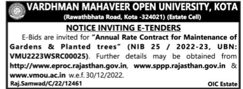 Tender for VARDHMAN MAHAVEER OPEN UNIVERSITY, KOTA (Rawathbhata Road, Kota -324021) (Estate Cell) E-Bids are invited for Annual Rate Contract for Maintenance of Gardens & Planted trees (NIB 25 / 2022-23, UBN: VMU2223WSRC00025).