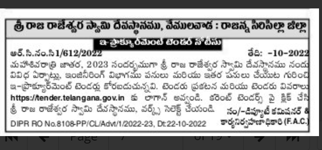 Tender for various arrangements, engineering department works and other works at Sri Raja Rajeswara Swamy Devasthanam on the occasion of Mahashivratri Jatara, 2023.