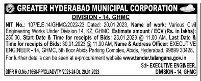 Tender for Various Civil Engineering Works Under Division 14, KZ, GHMC,