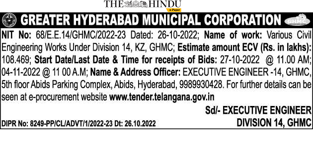 Tender for Various Civil Engineering Works Under Division 14, KZ, GHMC;