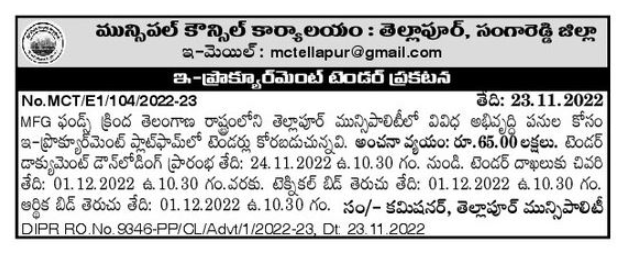 various development works in Telapur Municipality of Telangana State under MFG Funds. Estimated Cost: Rs. 65.00 lakhs.