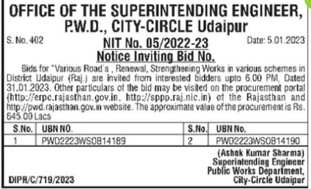 Tender for “Various Road’s, Renewal, Strengthening Works in various schemes in District Udaipur (Raj.)