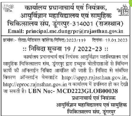 Tender for various works in Office of the Principal and Controller, Medical College and Group Hospital Association, Dungarpur – 314001 (Rajasthan)