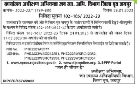 Tender for various works in the blocks under District Circle Jaipur Office of Superintending Engineer Public Health. Abhi. Department District Circle