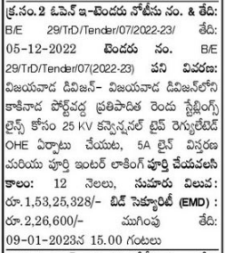 Tender for Vijayawada Division- In Vijayawada Division Installation of 25 KV Conventional Type Regulated OHE, Extension of 5A line and full interlocking for proposed two stabling lines at Kakinada Port Duration of completion:12 Months,