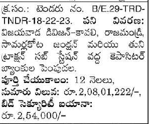 Tender for Vijayawada Division- Kavali, Rajahmundry.. Augmentation of Capacitor Banks at Samarlakota Junction and Tuni Traction Sub Station.