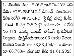 Vijayawada  KM between AKVD-UNDI stations in the division. Mid Section Guarded LC Gate at 104/4-5  Proposed interlocking of No.113 Construction. Duration of Completion: 06 (Six) Months.