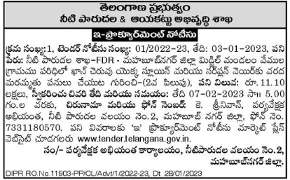 Tender for Water Drainage Department- FDR – Flood Repair Works of Khan Pond Sluice and Sarlan Weir under Vemula Village, Midjil Mandal, Mahbubnagar District