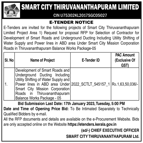 Development of Smart Roads and Underground Ducting Including Utility Shifting of Water Supply and Power lines in ABD area Under Smart City Mission Corporation Roads in Thiruvananthapuram Balance Works Package – 05
