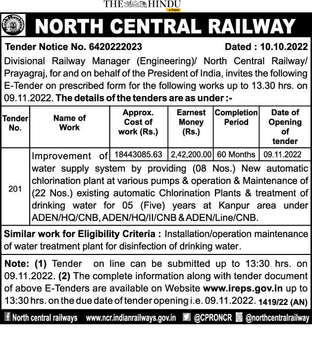 water supply system by providing (08 Nos.) New automatic chlorination plant at various pumps & operation & Maintenance of (22 Nos.) existing automatic Chlorination Plants & treatment of drinking water for 05 (Five) years at Kanpur area under ADEN/HQ/CNB, ADEN/HQ/II/CNB & ADEN/Line/CNB.