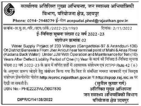 Tender for Water Supply Project of 233 Villages (Gangadtalai-97 & Anandpuri-136) Of District Banswara From Jher Anicut near terminal point of Mahi & Anas River (Kadana Back Water) Under JJM With Operation and Maintenance for Ten (10) Years After Defect Liability Period of One (1) Year In order to number 02 year 2022-23,