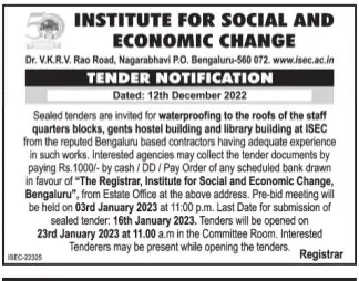 Tender for waterproofing to the roofs of the staff quarters blocks, gents hostel building and library building at ISEC from the reputed Bengaluru based contractors having adequate experience in such works.