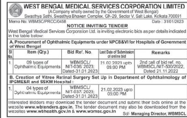 Tender for West Bengal Medical Services Corporation Ltd. is inviting electronic bics as per details indicated in the table below A. Procurement of Ophthalmic Equipments under NPCB&VI for Hospitals of Government of West Bengal