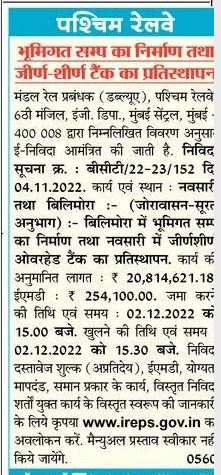 Tender for Western Railway Construction of underground sump and replacement of dilapidated tank.