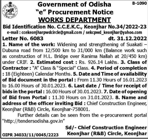 Tender for Widening and strengthening of Suakati – Dubuna road from 12/500 km to 31/000 km (Balance work such as construction of H.L. Bridge over Ranima Nallah at 20/450 km)