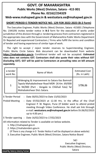 Tender for Widening & Improvement to Satara Kas Bamnoli Tapola Mahabaleshwar Road MDR-26 Km. 69/000 to 94/000 (Part Vengale to Chikhali Fata) Tal Mahabaleshwar Dist.-Satara.