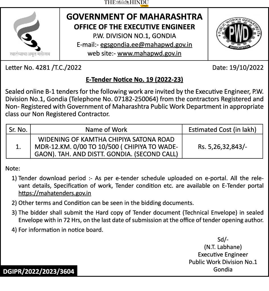 Tender for WIDENING OF KAMTHA CHIPIYA SATONA ROAD MDR-12.KM. 0/00 TO 10/500 (CHIPIYA TO WADE GAON). TAH. AND DISTT. GONDIA. (SECOND CALL)