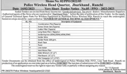 Tender for Wind Noise Pler Sealed Tenders are invited from those Income tax/Goods and services Tax payee dealers/Manufacturers/Suppliers Authorized agents of the firms who are registered in Jharkhand State before the date of publication of this Tender for the supply of General Technical Spare Parts For Wireless Equipment to Jharkhand Police Wireless HQr. Ranchi to reach the undersigned Sealed envelope should be superscribed as TENDER OF GENERAL TECHNICAL