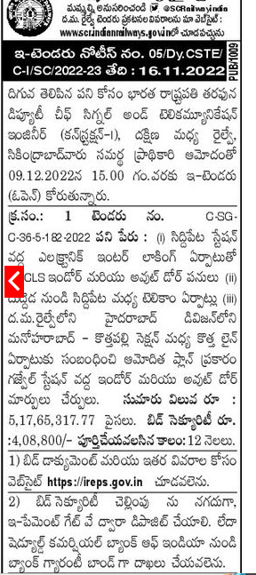 Tender for With arrangement of electronic interlocking at Siddipet station • CLS indoor and outdoor works Telecom arrangements between Buddeda to Siddipet .