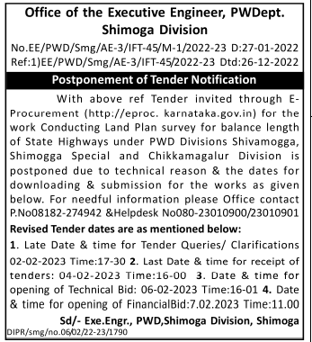 Tender for work Conducting Land Plan survey for balance length. of State Highways under PWD Divisions Shivamogga, Shimogga Special and Chikkamagalur Division