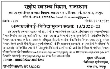 Tender for work for a construction work in the Medical and Health Department through post qualification method is Rs. 164130 Lakhs in the appropriate category for the Public Works Department, State Government