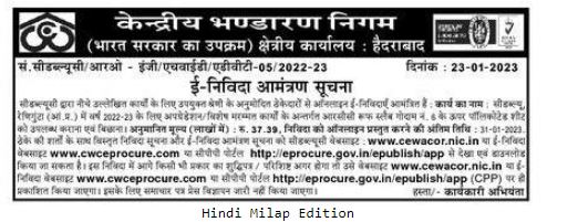 Tender for work for the year 2022-23 in CW Reguita (A.P.) under updation special repair works available on polycoated sheet above RCC godown