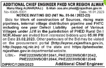 Tender for Work of construction of Sources, rising main pipelines, internal village distribution pipeline and FHTC including one year Defect Liability period of Various