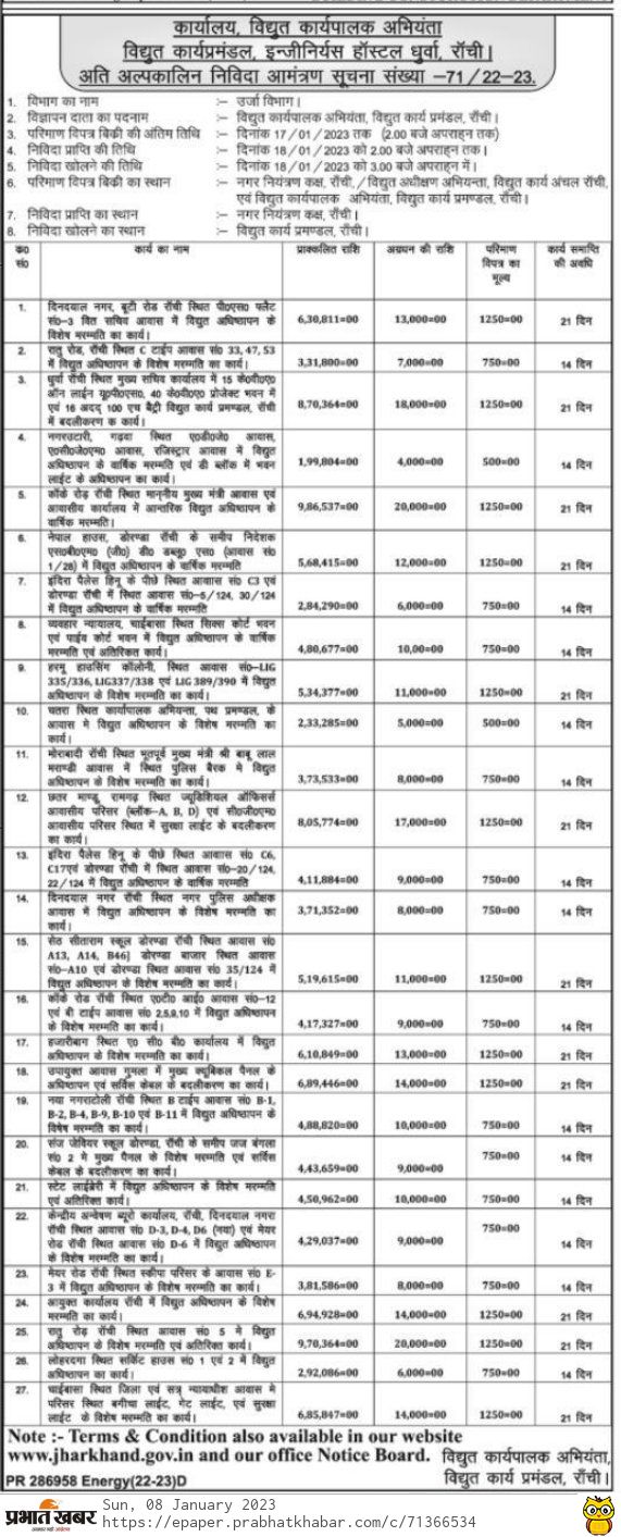 Tender for Work of installation of main cubicle panel and replacement of service cable in Deputy Commissioner’s residence Gumla