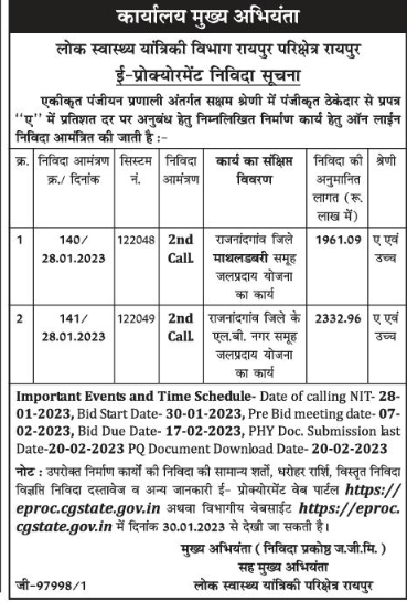 Tender for Work of Mathaldbari group water supply scheme in Rajnandgaon district L of Rajnandgaon district. B. City group water supply scheme work Tender Category