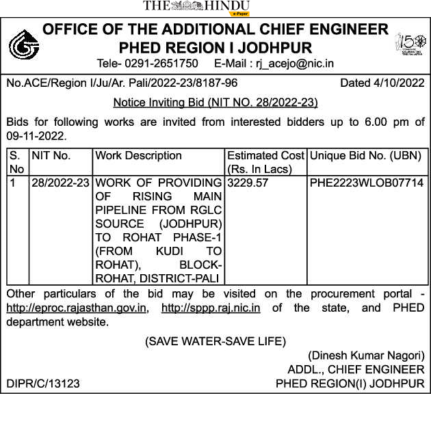 WORK OF PROVIDING OF RISING MAIN PIPELINE FROM RGLC SOURCE (JODHPUR) TO ROHAT PHASE-1 (FROM KUDI TO PLEASURE), BLOCK ROHAT, DISTRICT-PALI