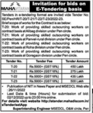 Tender for Work of providing skilled outsourcing workers on contract basis at Alibag division under Pen circle.