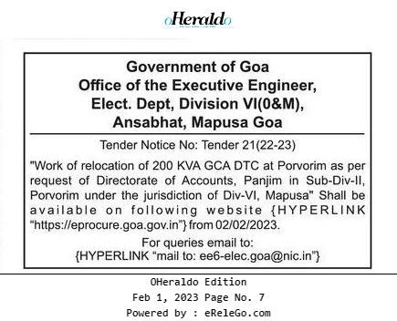 Tender for Work of relocation of 200 KVA GCA DTC at Porvorim as per request of Directorate of Accounts, Panjim in Sub-Div-II,