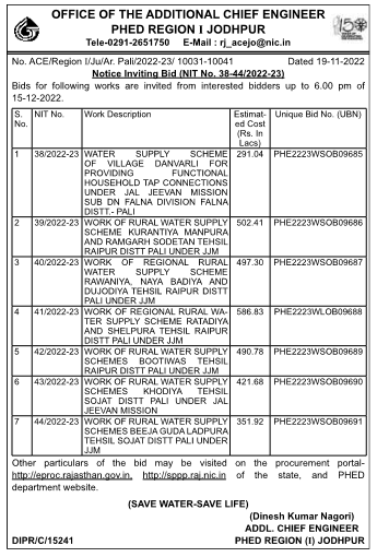 Tender for WORK OF RURAL WATER SUPPLY SCHEME KURANTIYA MANPURA AND RAMGARH SODETAN TEHSIL RAIPUR DISTT PALI UNDER JJM