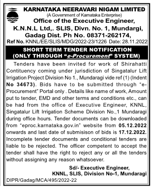 Tender for work of Shirahatti Contituency coming under jurisdiction of Singatalur Lift Irrigation Project Division