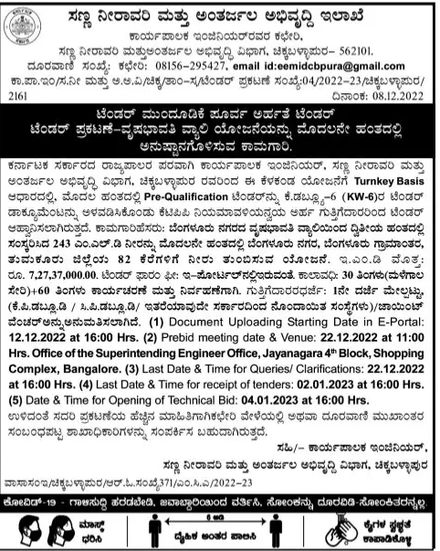 Tender for Work on implementation of Vrishabhavati Valley Project in the first phase, On behalf of the Governor of Karnataka, the Executive Engineer, Minor Irrigation and Ground Water Development Division, Chikkaballapur