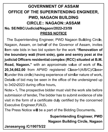 Tender for work “Renovation of the boundary wall (front side), gate and sentry post at the judicial Officers residential complex (RCC) situated at B.M. Road, Nagaon.”