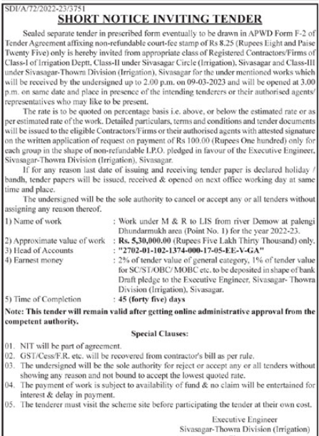 Tender for Work under M & R to LIS from river Demow at palengi Dhundarmukh area (Point No. 1) for the year 2022-23.