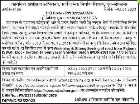 Tender for Works Department, Rajasthan registered contractors and Central / State Government and their authorized organizations / Central Public Nigangan / Postal and Telecommunication Department, Railway etc. registered