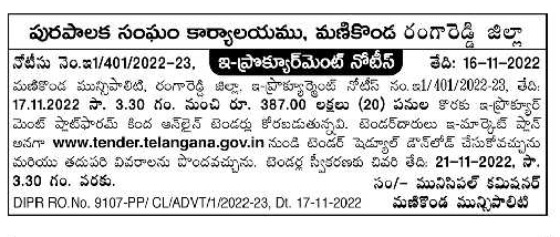 works worth Rs.387.00 Lakhs in MANIKONDA MUNICIPALITY, RANGAREDDY DISTRICT, E-PROCUREMENT