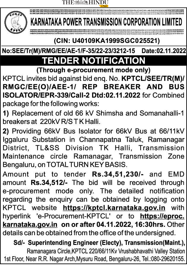 Tender for1) Replacement of old 66 kV Shimsha and Somanahalli-1