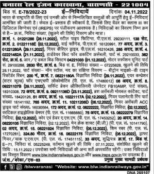 Tender forBanaras Rail Engine Factory, Varanasi 221004 .Bid No. E-78/2022-23