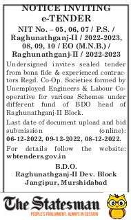 Undersigned invites sealed tender from bona fide & experienced contractors Regd. Co-Op. Societies formed by Unemployed Engineers & Labour Co- operative for various Schemes under different fund of BDO head of Raghunathganj-II Block.