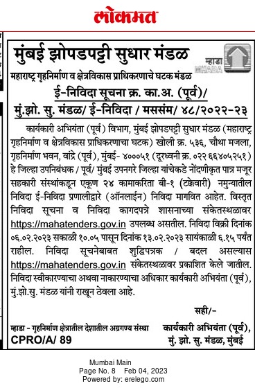 Tender in B-1 (Percentage) form for a total of 24 works from Eligible Labor Co-operative Societies registered with District Deputy Registrar / East / Mumbai
